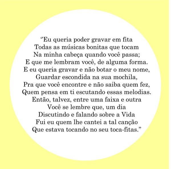 Este post originalmente continha uma playlist (secreta) feita no grooveshark. Como o grooveshark não existe mais, eu substituí o link por outra playlist, no Spotify. Eu ia simplesmente colocar uma playlist antiga qualquer, mas decidi que precisava fazer uma nova. Ela não está pública, então fica como um segredinho de todo mundo que encontrar esse post. Não são nem de longe as mesmas músicas que eu escutava quando escrevi este poema – são as músicas que me faziam pensar na última pessoa por quem eu tive sentimentos. Nunca compartilhei essa coleção com outros, então fica só entre nós 🙂