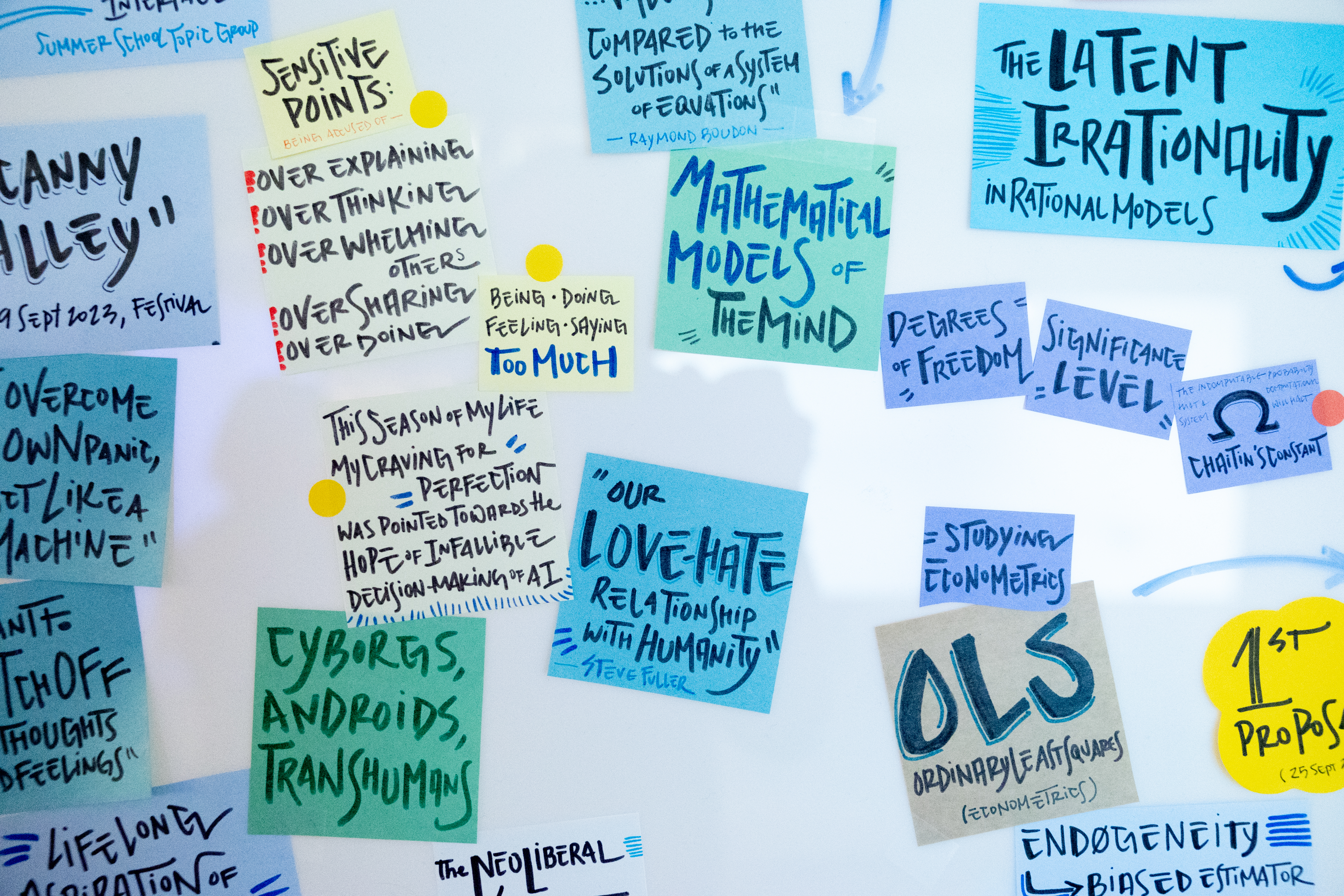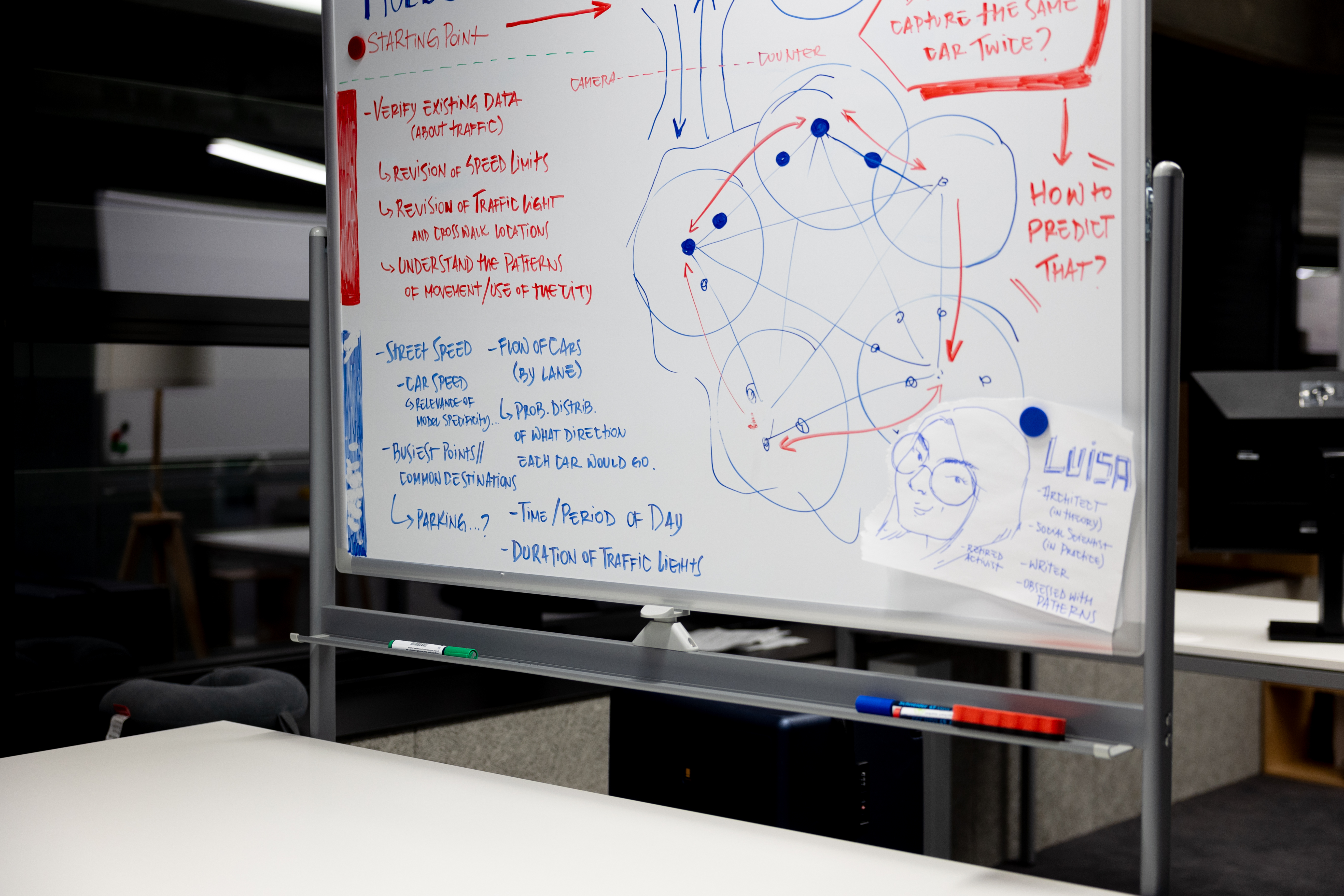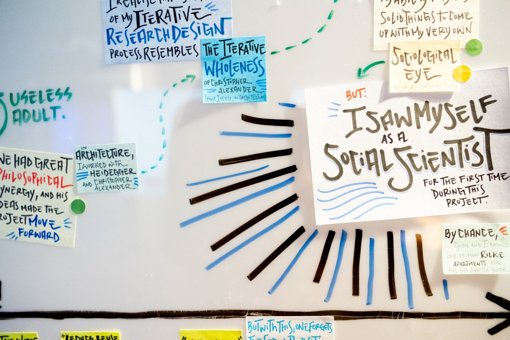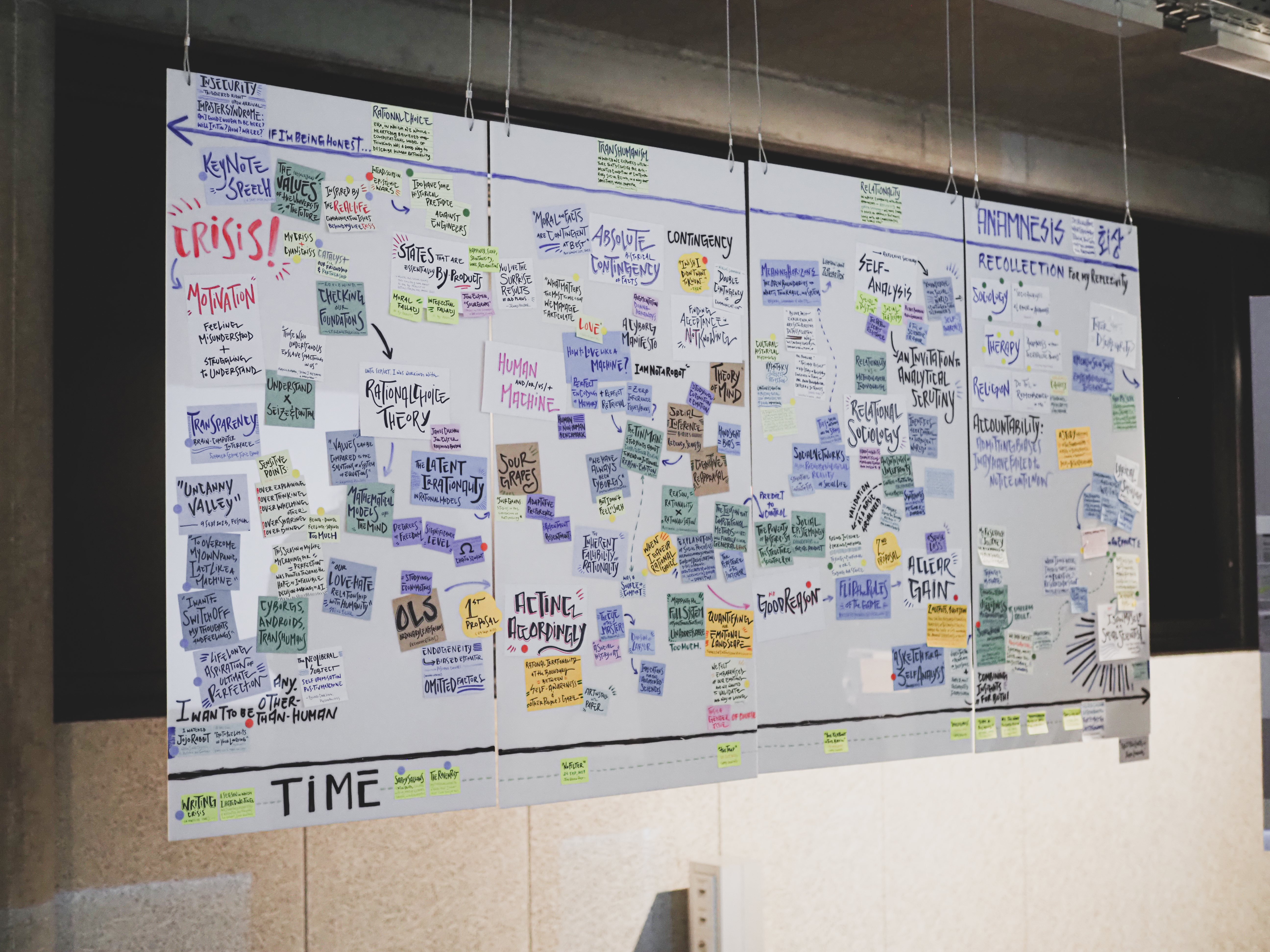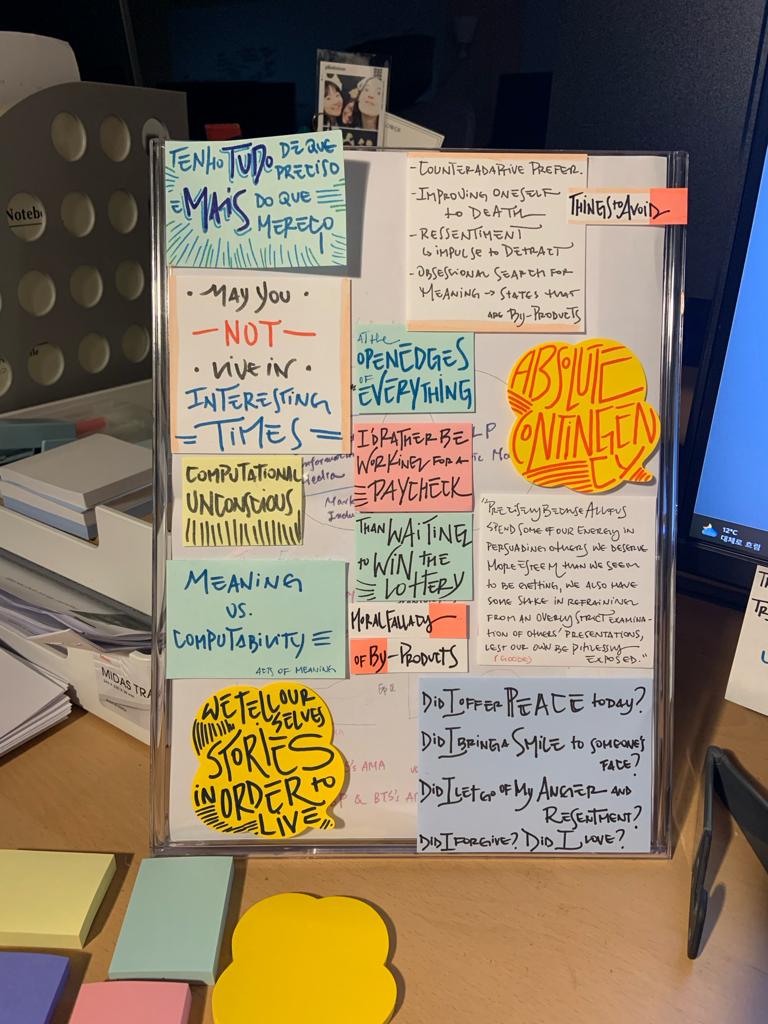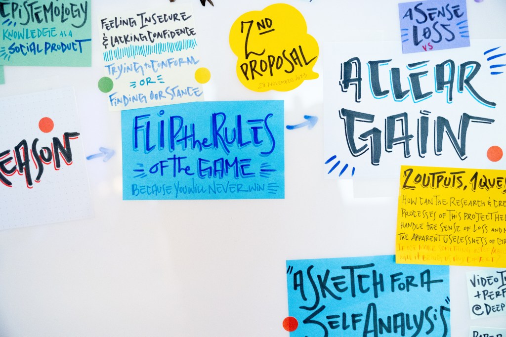 “Go to the limits of your longing” is a map of the shared intellectual journey that Cyan and I went through when developing the philosophical framework for our project, how it intertwines with our personal life and emotional processes, and my growth as a Sociologist. The map narrates our journey from trying to develop a project that would validate our feelings, towards aggregating perspectives and insight into a framework that would put the characteristics we were conscious about to the service of science and creativity. It employs insight from our conversations, therapy sessions and meetings with my Professor and other peers. The whiteboard format with post-its reflects our own creative process, extensively documented around the shared space of the Founding Lab.